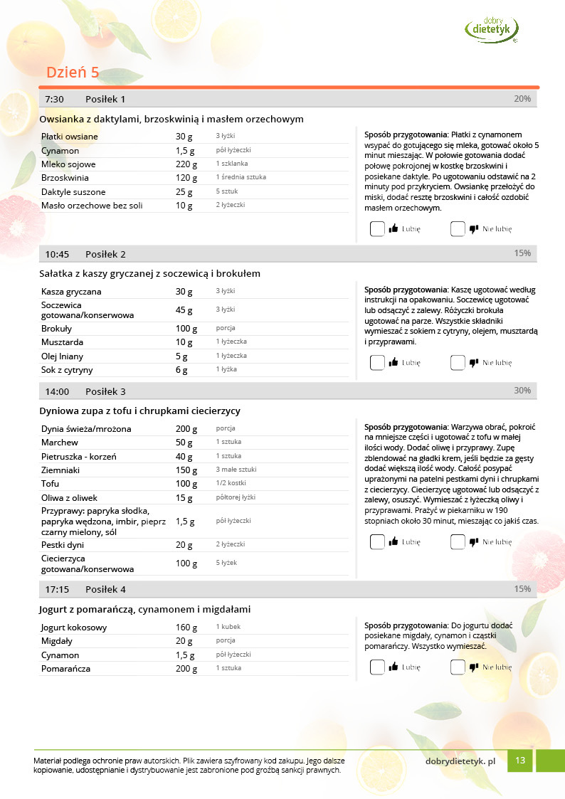 w formie propozycji posiłków (zamiast pojedynczych jadłospisów jednodniowych, przygotowano propozycje kilku propozycji dań na każdy posiłek). Tutaj nie uzależniamy Cię od tego jakie masz np. w danym dniu zjeść śniadanie czy obiad, tylko sam wybierasz sobie ulubione danie z kilku przedstawionych przez nas propozycji.