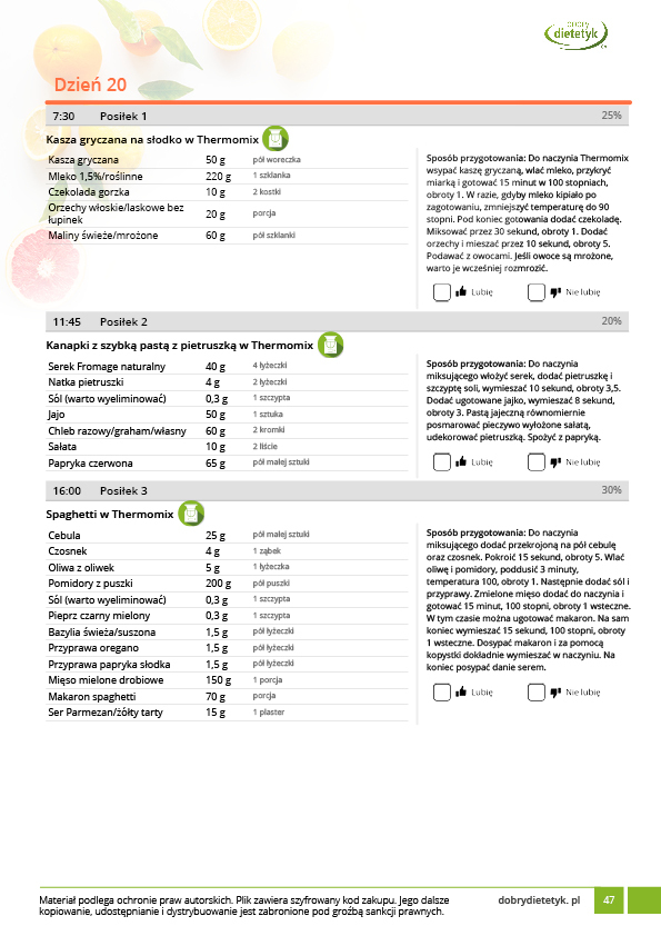 Kompleksowy 30-dniowy program redukcyjny dla mężczyzn uwzględniający w przewadze dania na THERMOMIX. Program zawiera szczegółowy, 30-dniowy jadłospis na 1800kcal uwzględniający 4 posiłki w ciągu dnia. Program realizuje potrzeby odżywcze organizmu mężczyzn a także wymagania związane z najczęściej występującymi wymaganiami zdrowotnymi (regulacja ciśnienia krwi, wspomaganie pracy serca i układu krążenia, regulacja hormonalna). W opracowaniu tej diety uwzględniono dużą ilość posiłków na Thermomix co ma ułatwić stosowanie planu żywieniowego panom posiadającym tego typu urządzenie. Dania na Thermomix zamieszczone w tym opracowaniu nie zawierają typowych przepisów jakie można znaleźć w internecie. Są to dania specjalnie opracowane lub zmodyfikowane pod kątem diety redukcyjnej. Wszystkie porcje są również podawane w przeliczeniu na jedną osobę. Stosowanie tej diety nie tylko przyczyni się do szybkich efektów w redukcji masy ciała, ale także pozwoli poznać nowe, pyszne przepisy na Thermomix.