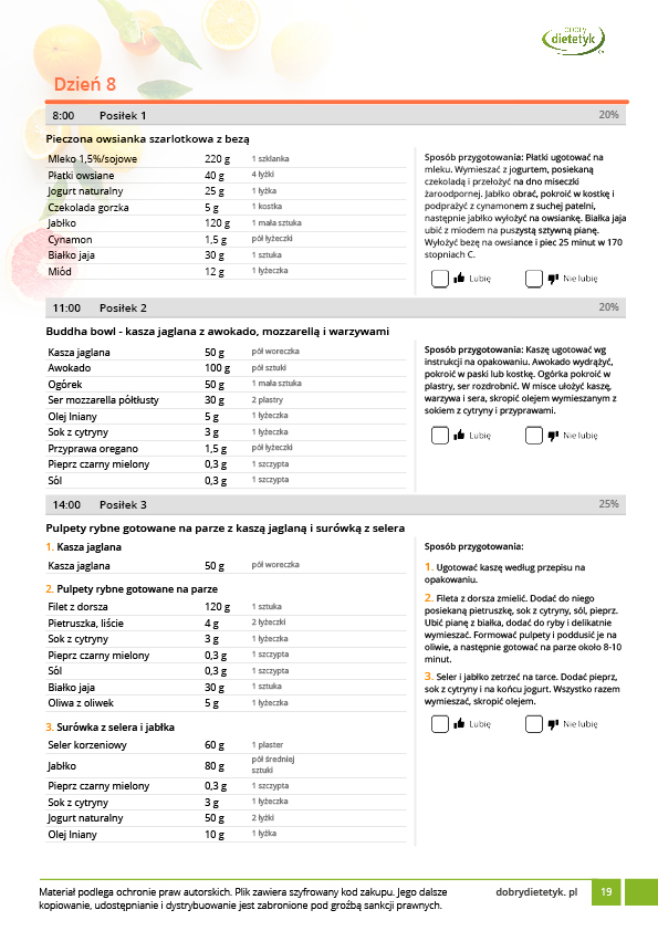 w formie propozycji posiłków (zamiast pojedynczych jadłospisów jednodniowych, przygotowano propozycje kilku propozycji dań na każdy posiłek). Tutaj nie uzależniamy Cię od tego jakie masz np. w danym dniu zjeść śniadanie czy obiad, tylko sam wybierasz sobie ulubione danie z kilku przedstawionych przez nas propozycji.
