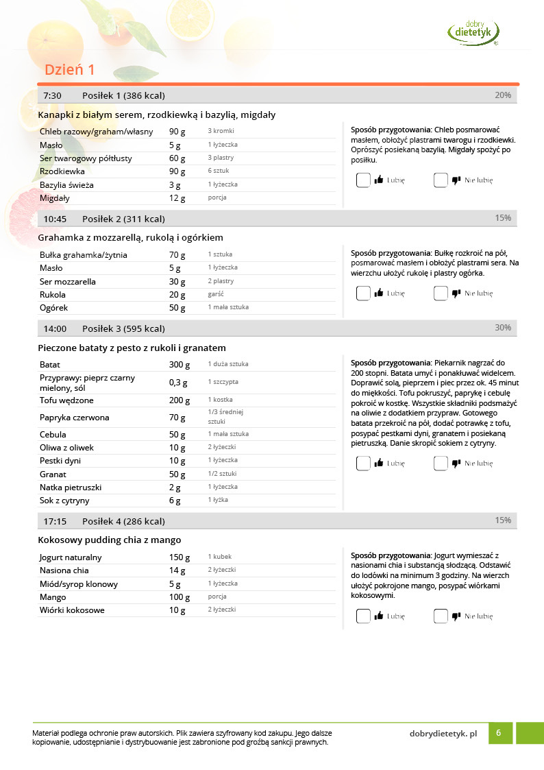 w formie propozycji posiłków (zamiast pojedynczych jadłospisów jednodniowych, przygotowano propozycje kilku propozycji dań na każdy posiłek). Tutaj nie uzależniamy Cię od tego jakie masz np. w danym dniu zjeść śniadanie czy obiad, tylko sam wybierasz sobie ulubione danie z kilku przedstawionych przez nas propozycji.